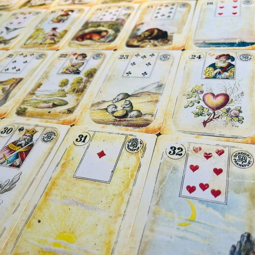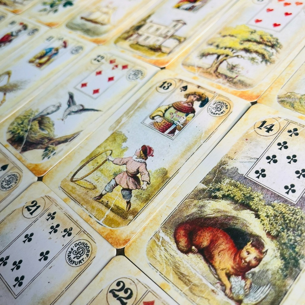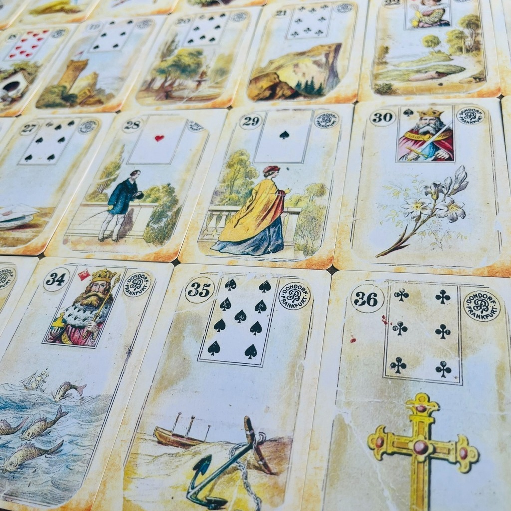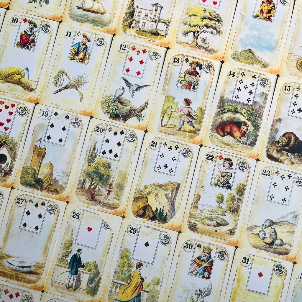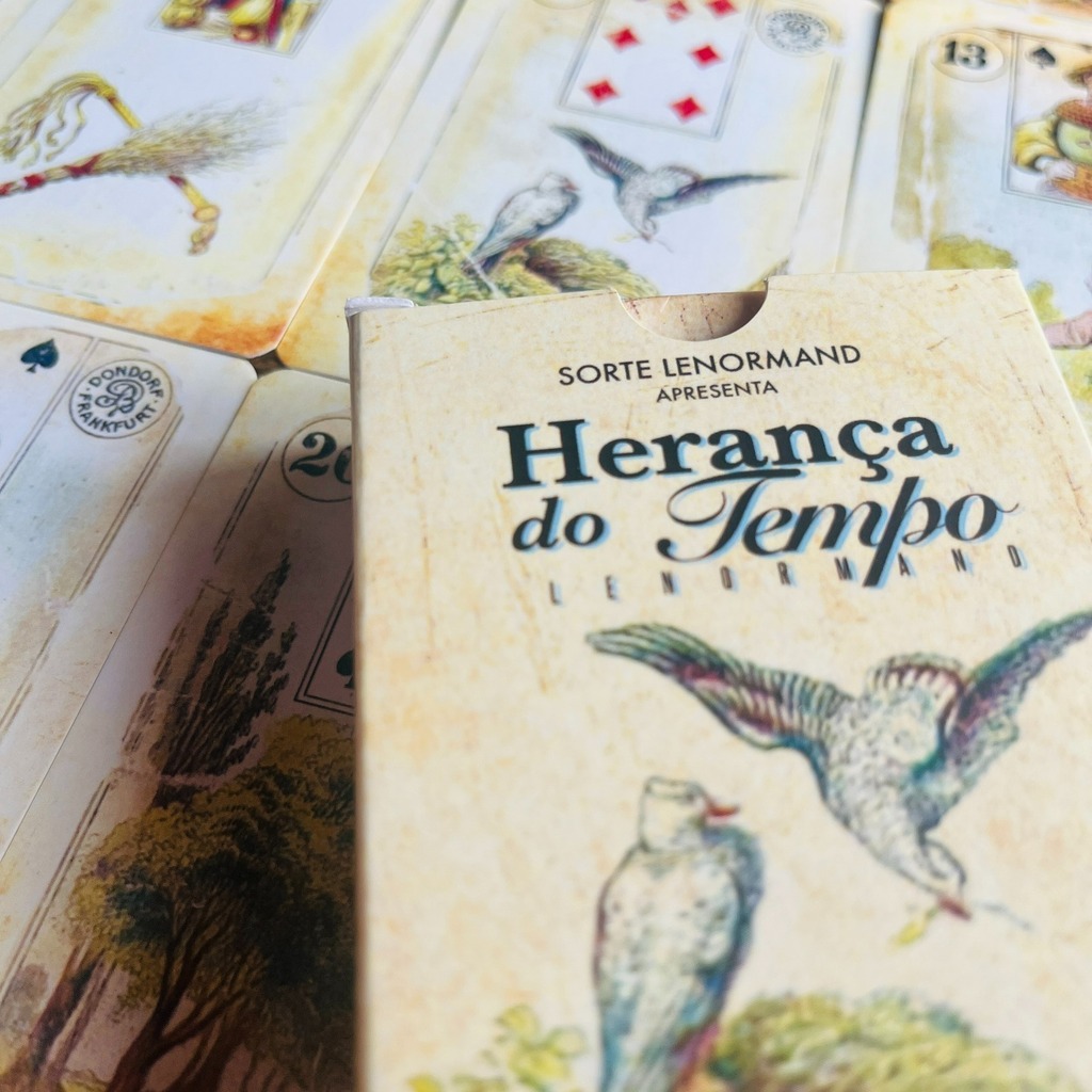 O "Herança do Tempo Lenormand" é uma reprodução do clássico Dondorf Lenormand, uma relíquia de 1880, composta por 36 cartas que encapsulam a essência do passado. As imagens, marcadas pelo desgaste natural e pelo charme nostálgico, capturam de forma poética a passagem do tempo. As cartas medem 10 cm por 6,5 cm e vêm acompanhadas de um livreto com os significados.