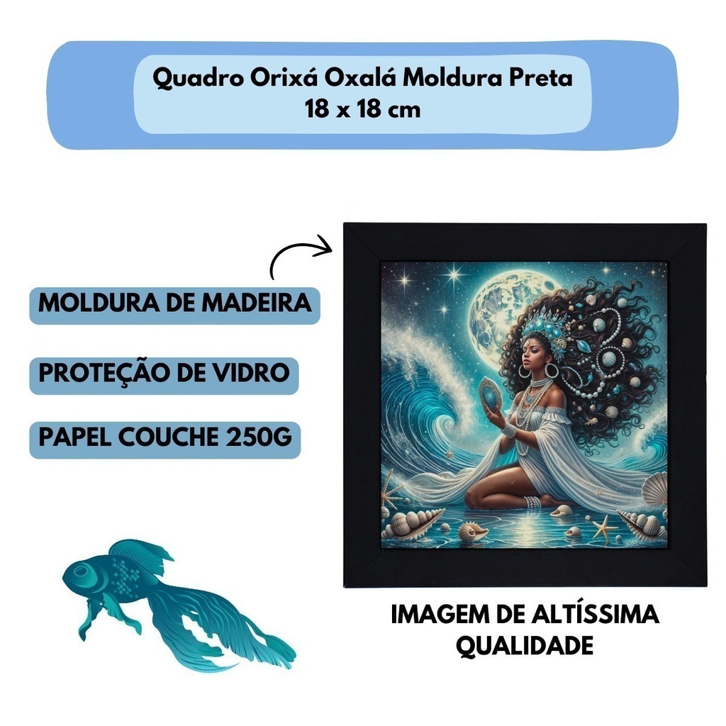 Quadro Orixá Iemanjá. Conecte-se com a energia divina de Iemanjá, a poderosa Orixá das águas e da proteção materna, com este quadro encantador. Com moldura preta de 18 x 18 cm, ele traz sofisticação e espiritualidade para qualquer ambiente. Ideal para quem busca harmonia, proteção e beleza, esse quadro é perfeito para decorar sua casa, escritório ou até mesmo para presentear alguém especial.