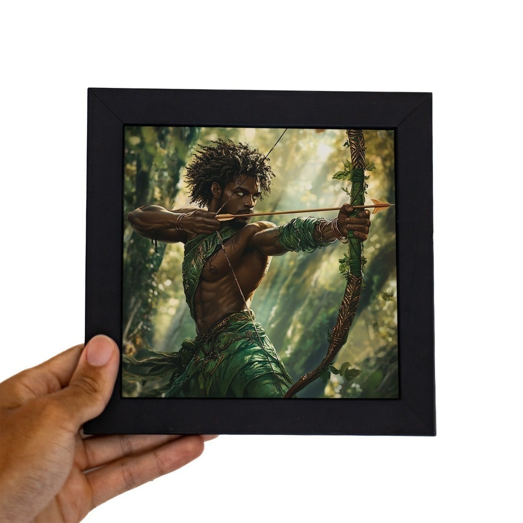 Quadro Orixá Oxóssi. Conecte-se com a energia vibrante de Oxóssi, o Orixá da caça, da abundância e da sabedoria, com este quadro encantador. Com moldura preta de 18 x 18 cm, ele traz um toque de natureza e espiritualidade para qualquer ambiente. Ideal para quem busca prosperidade, proteção e harmonia, esse quadro é perfeito para decorar sua casa, escritório ou até mesmo para presentear alguém especial.