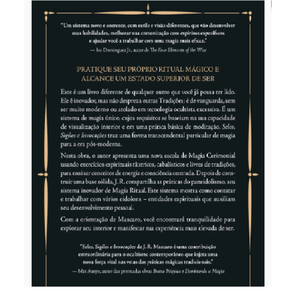 Este é um livro diferente de qualquer outro que você já possa ter lido. Ele é inovador, mas não despreza outras Tradições; é de vanguarda, sem ser muito moderno ou atolado em tecnologia ocultista excessiva. É um sistema de magia único, cujos requisitos se baseiam na sua capacidade de visualização interior e em uma prática básica de meditação. Selos, Sigilos e Invocações traz uma forma transcendental particular de magia para a era pós-moderna.