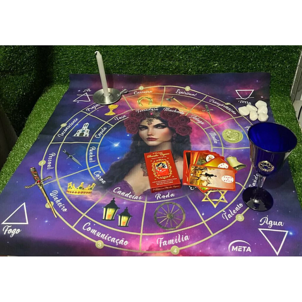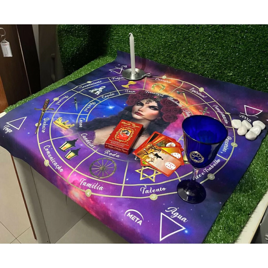 Toalha de Mesa Cigana para jogos de cartas Esta toalha de mesa é ideal para jogos de cartas, deixando sua mesa bonita, moderna e sofisticada e intuitiva. Ela foi totalmente desenvolvida pensando em deixar o seu jogo de cartas mais confortável e prático é composta por tecido, linda estampa, o que oferece ainda mais requinte ao teu jogo.